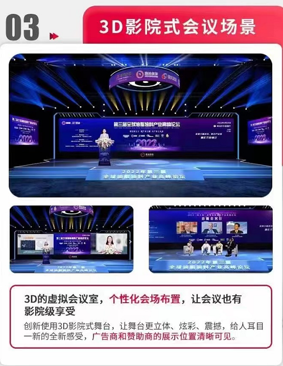 Third, the 3D cinema-style conference scenario has been upgraded. The innovative use of a 3D cinema-style stage makes the stage more three-dimensional, colorful, and stunning, providing a new and refreshing experience, with advertisement and sponsor display positions clearly visible.