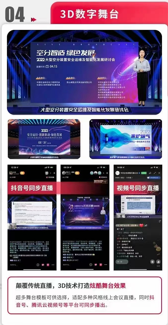 Fourth, the 3D digital stage has been upgraded to accommodate various styles of online conference live broadcasts, and can be simultaneously broadcast on platforms such as Douyin and Tencent Cloud Video.