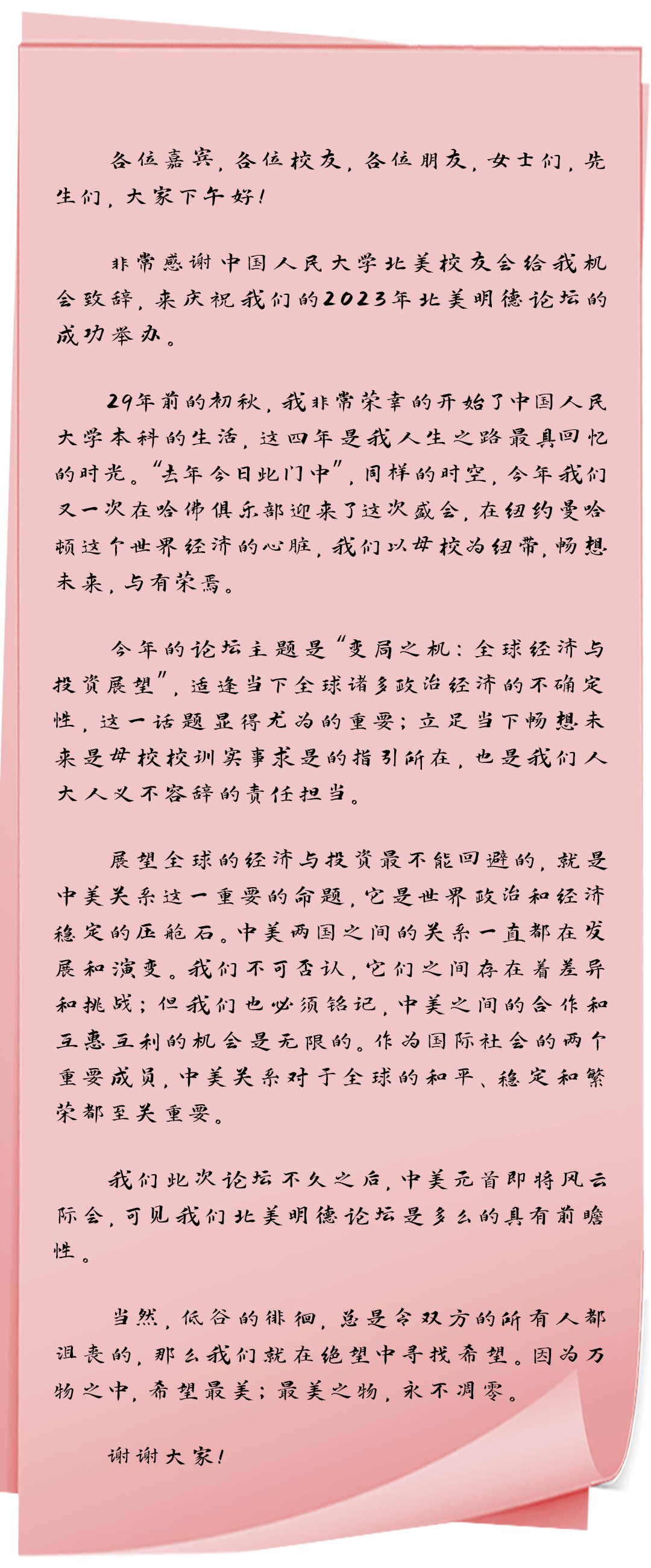 This meeting is particularly significant as it precedes the APEC summit in San Francisco, USA, where Chinese and American leaders will meet. Numerous elite alumni from Wall Street have provided insights into the future of the global economy and investments, and conducted thorough discussions on the development of China-U.S. relations.